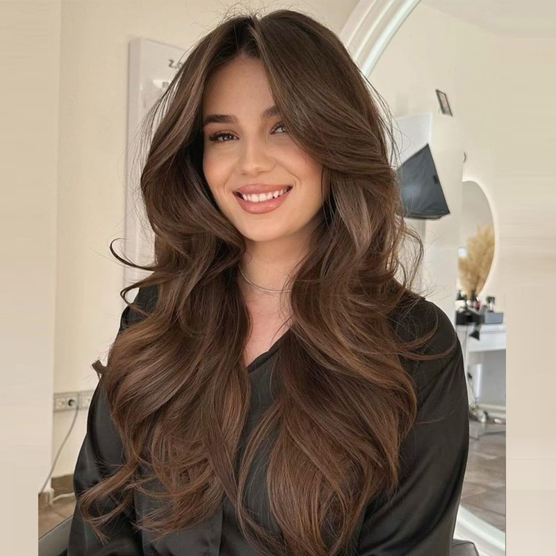 Style:Long Dark Brown Layered Wavy Wigs with Curtain Bangs