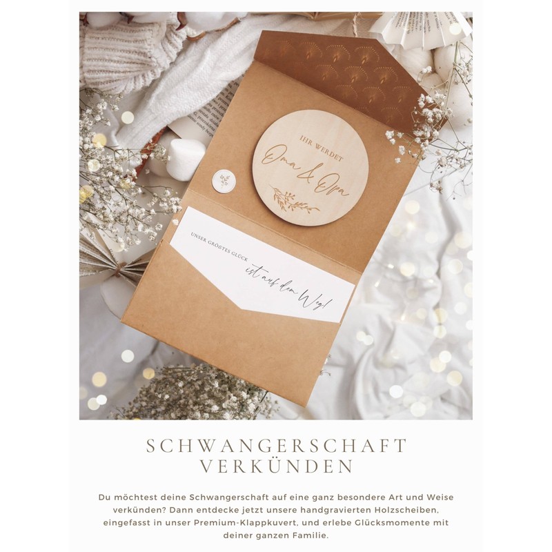 - Unique, special and very personal. Discover our pregnancy announce wooden discs, fitted into our premium folding envelope with matching adhesive seal.