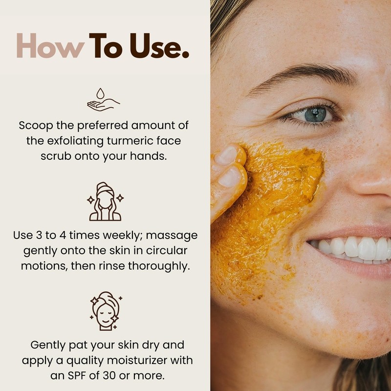 - 🟧 TURMERIC SCRUB – Gently yet effectively exfoliates skin with no irritation. Buffs away dead skin cells, dirt, and removes excess oil. Gradually improves acne, skin tone, texture, and radiance to reveal beautiful glowing skin. Made for both men and women.