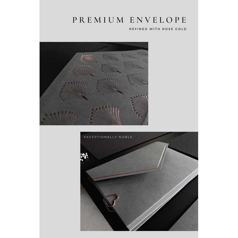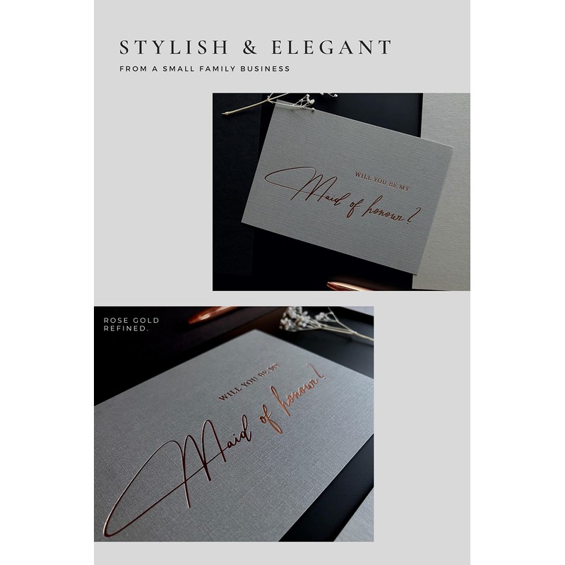- For the love of uniqueness, our font is handwritten and hot foil stamped in rose gold, printed on 350g Italian design paper and comes with a premium envelope with a genuine wax seal.