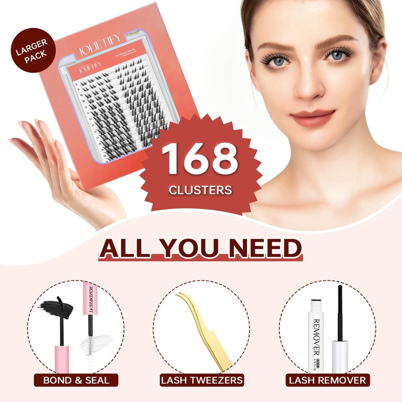 - All-in-One DIY Lash Extension Kit: The Jolietify Lash Extension Kit is a complete set for achieving professional-quality lashes at home. This kit includes DIY faux mink cluster lashes (8-16mm), a Waterproof Bond & Seal, lash tweezers, and eyelash remover. Perfect for beginners and professionals, this kit ensures you achieve a natural look with soft & fluffy lashes every time. Whether for daily use or special events, you’ll enjoy a long-lasting hold.