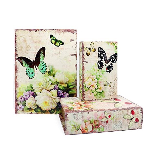 Jolitac Decorative Book Boxes World Map Pattern Antique Book Invisible box with Magnetic cover, Faux Wood Set of 3 Storage Set (Butterfly)