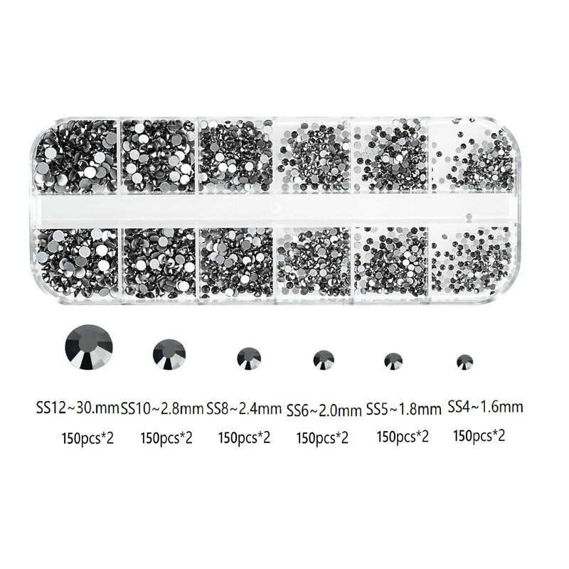 - Flat back rhinestones, 6 sizes: SS4 ~ 1.6 mm, SS5 ~ 1.8 mm, SS6 ~ 2.0 mm, SS8 ~ 2.4 mm, SS10 ~ 2.8 mm, SS12 ~ 3.0 mm