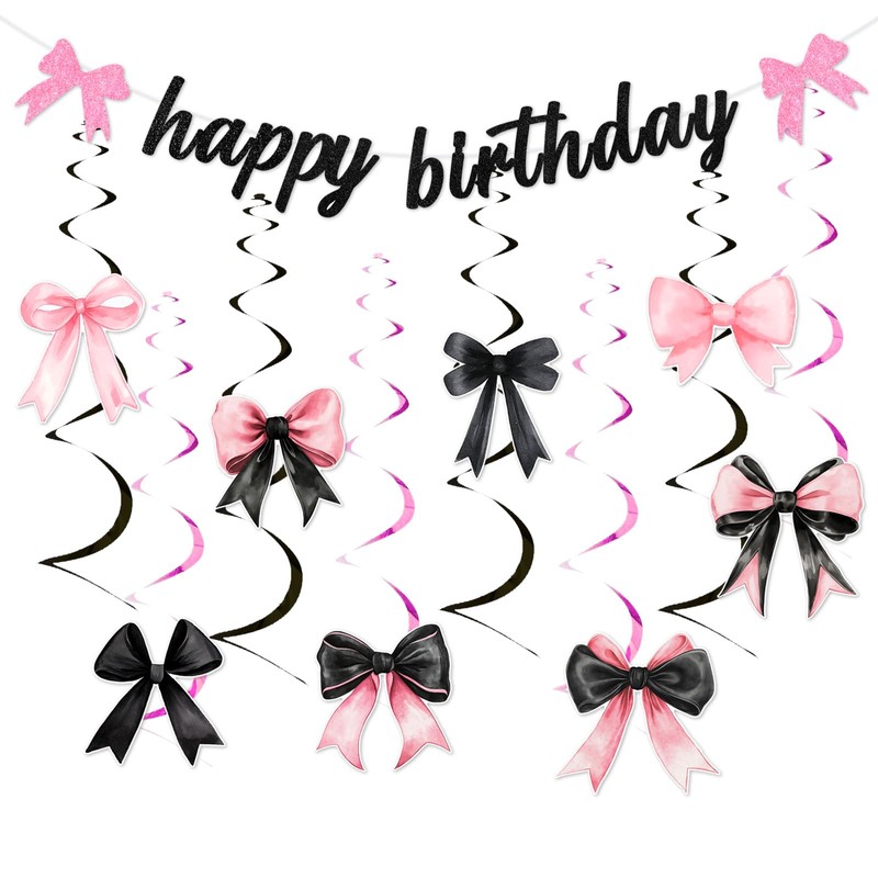 - PARTY THEME: You will get 1x Happy Birthday Banner and 8x Pink Black Bow Hanging Swirls, Black and pink bow-themed birthday party decorations featuring coquette style elements ideal for women and girls' celebrations, one pack can help you hold an unforgettable black and pink coquette birthday party