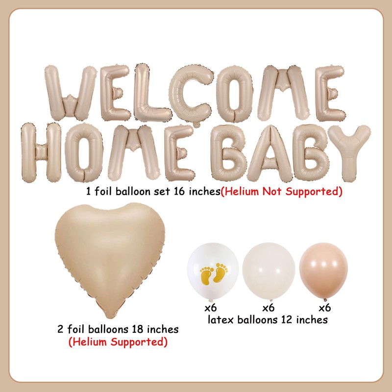 Welcome Home Baby Decorations Package Includes: 1x 16 inches Welcome Home Baby Foil Balloon(Not Helium Supported) 2x 18 inches Love Heart Foil Balloons(Helium Supported) 18x 12 inches Latex Balloons(6 white, 6 sand white, 6 beige)