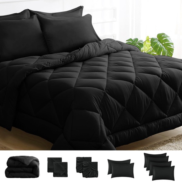 JOLLYVOGUE 11 Pieces Queen Comforter Set, Reversible Bed in a Bag Queen Size, All Season Bedding Set with Soft Black Comforter, Flat Sheets, Fitted Sheets, Pillowcases & Shams