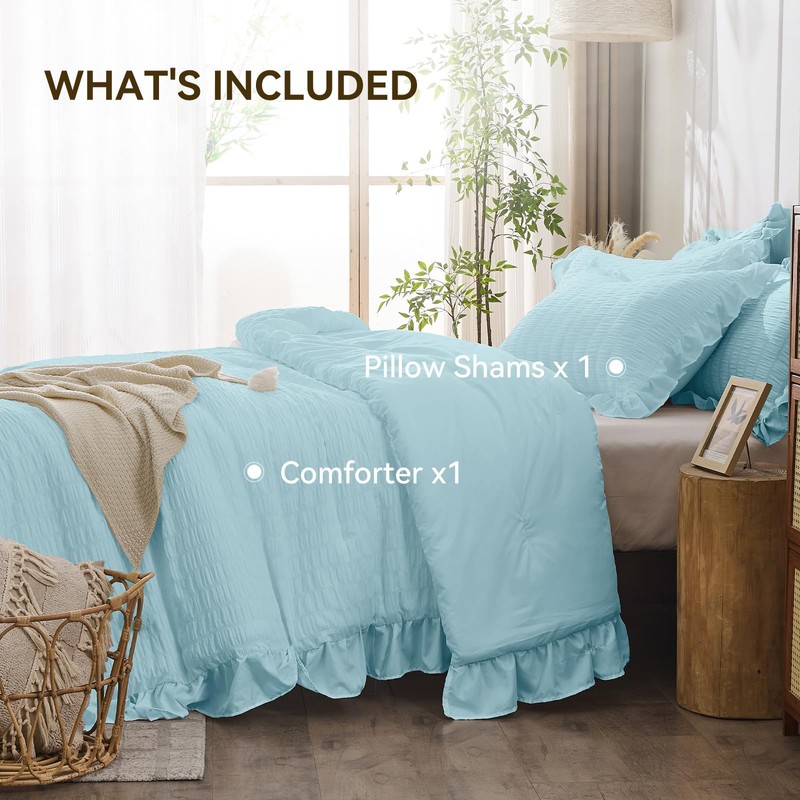 JOLLYVOGUE Blue Twin Size Comforter Set, 2 Pieces Seersucker Lightweight Fluffy Bedding Set, Twin Ruffle Comforter, All Season Soft Microfiber Shabby Chic Bed Set