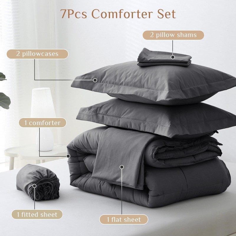 JOLLYVOGUE Full Comforter Set, Ultra-Soft Bed in a Bag Full Size 7 Pieces, Oeko-TEX Certified Bedding Set with Down Alternative Comforter, Sheets, Pillowcases & Shams, Dark Grey