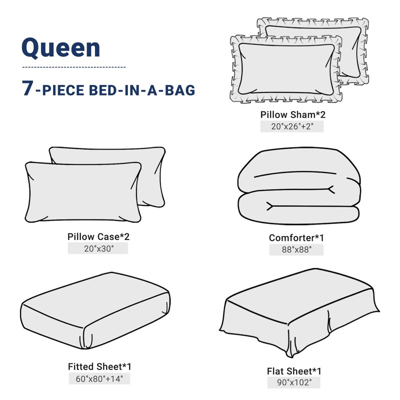 - [What You Can Get]: Jollyvogue queen bed in a bag sets include: 1 comforter (90"x 90"), 1 flat sheet (90"x 102"), 1 fitted sheet (60"x 80"x14"), 2 pillowcases (20"x 30") and 2 pillow shams (20"x 26").