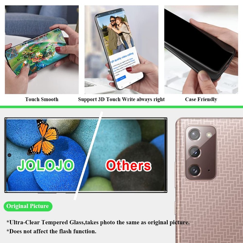 - [All Around Maximum Protection] ----- JOLOJO research and developed special accessories for galaxy note 20(6.7").The package included 2 Pack Tempered Glass screen protector + 2 Pack Camera Lens Protector + 2 Pack Back Film offer the all around maximum protection for your note 20 6.7"(NOT for note 20 ultra - 6.9").