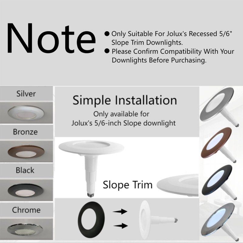 - Note-Only Suitable For Jolux's Recessed 5/6" Slope Trim Downlights: With a maximum inner diameter of 4.44 inches, an outer diameter of 7.59 inches and a thickness of only 0.37", this trim is suitable for 5/6" recessed ceiling lighting fixtures, and currently only suitable for Jolux's recessed 5/6" slope trim downlights. Please confirm compatibility with your downlights before purchasing.