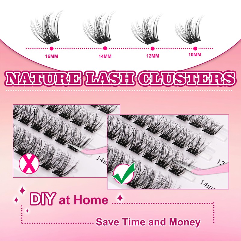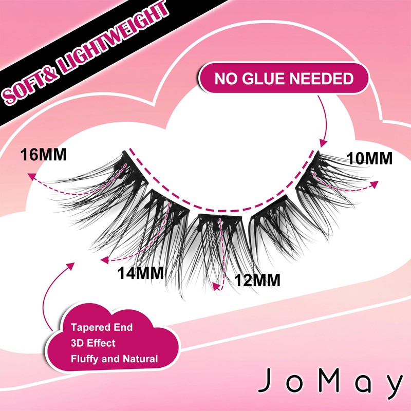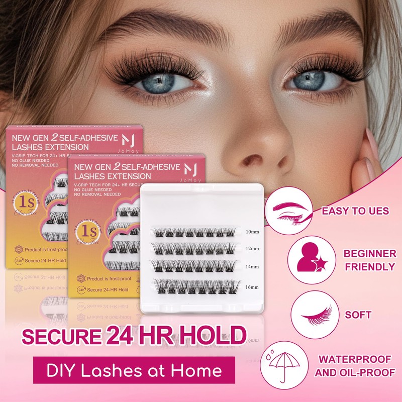 JoMay New Gen 2 Self-Adhesive lash Extension Kit Pre-Glued Wispy Cluster Lashes Press on Lashes Natural Lashes No Glue 1 Step DIY Lash Easy to Apply & Remove Long-Lasting Hold 64Pcs (X1-10-16mm MIX)