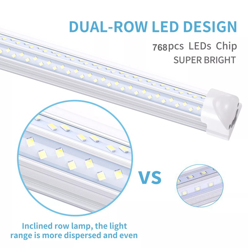 Double Side 4 Rows V Shaped Integrate T8 LED Tube Lamp 4ft 8ft Tube T8 Fixture LED Fluorescent Tubes Light Cooler Door Lighting Specification: Model Name: T8 Integrated V Shaped LED Tube Length: 8FT Power: 8FT 120W LED Source: 2835SMD Lumens: 110-120 Lm/W Base Type: Integrated (With Bracket) Beam Angle: 270 Degree Voltage: AC85-277V Housing material: Aluminum Drive: Built-in drive CRI: > 80 Power factor:>0.90 Operation temperature: -20C to 50C Life: 50,000 hours Frequency: 60Hz to 50Hz Warranty:3 Years PC cover: Clear Color temperature: Cold White (6000K-6500K)