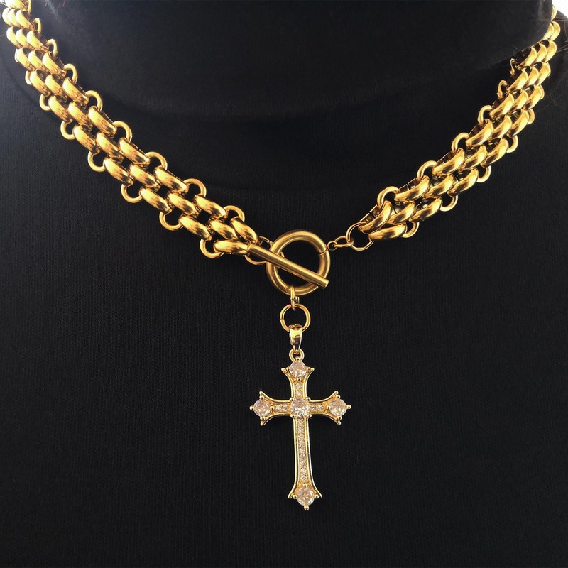 jomjeu Cross Necklace for Women Chunky Gold Necklace 18K Gold Plated Stainless Steel Chain Pendant Necklace Classic Trendy Toggle Thick Gold Necklaces Jewelry Gifts for Women