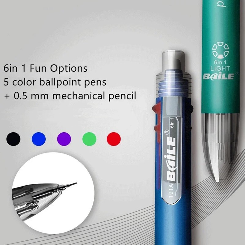6 in 1 Ballpoint Pen Set with Retractable Five Color All-in-One Machine Pen, Multifunction Pen, Stationery with Pencil Lead