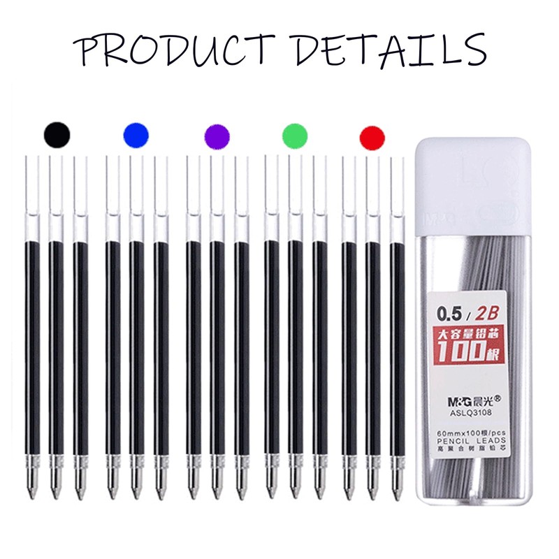 • [6 in 1 Neutral Pen Set] Package includes 2 neutral 6 in 1 pens and replaceable leads: red (3 pens), black (3 pen), blue (3 pen), purple (3 pen), green (3 pen), 0.5mm2B leads (100 pens, 60mm)