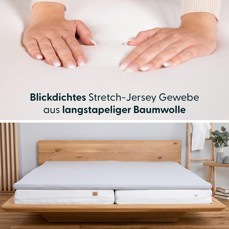 - Service and care: Jona topper bed sheet with elastic band is produced in Austria environmentally friendly and is suitable for all types of mattresses with a height of up to 30 cm. The fitted sheet for toppers is made from 95% cotton and 5% elastane. You can machine wash it at 60 °C and sleep for 30 nights.