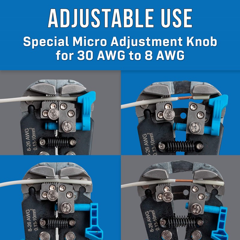 - ADJUSTABLE USE: Special micro adjustment knob allows the tool to work on cables as small as 30 AWG and as large as 8 AWG