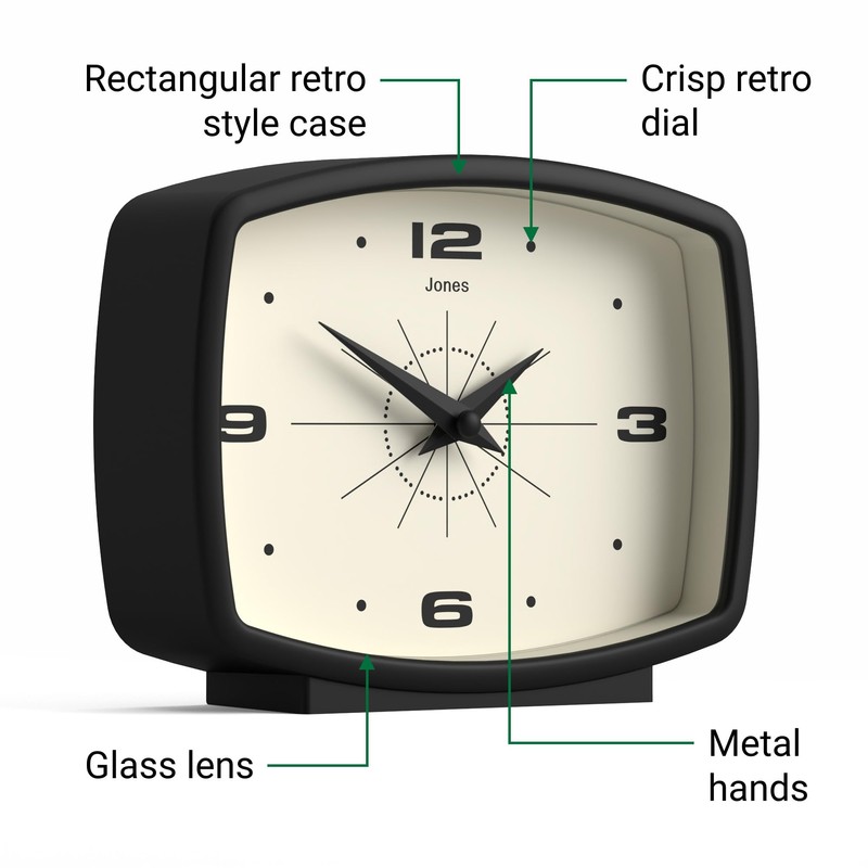 JONES CLOCKS® 'Film' desk clock - retro rectangular design in black, cool look for shelf, table, mantel, or bedside