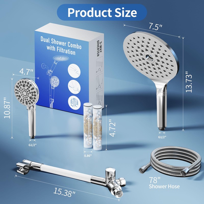 - 【Dual Shower Head Combo】:The filtering shower head and handle set includes a 7.5-inch rainfall shower head and a 4.7-inch handheld shower head. The rainfall shower head provides a wide range of water flow to simulate the experience of showering in the rain. The handheld shower head is equipped with 9 modes to provide a variety of showering options for you. You can easily switch between two shower heads by simply turning the 3-way diverter.