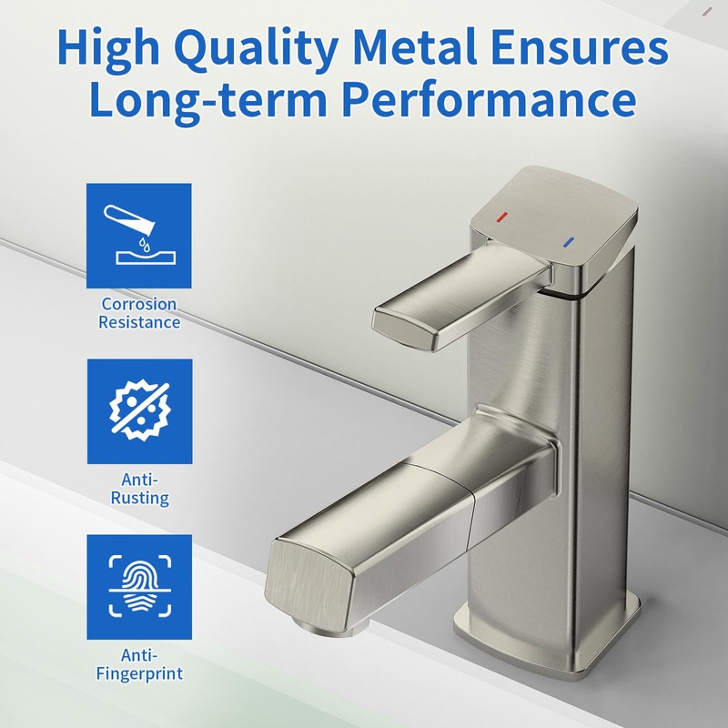 - 【Single Handle Modern Vanity Faucet】: The classic single handle design can achieve dual control of hot and cold water, which is convenient for adjusting water temperature and water flow. Meanwhile, the spout is designed with a fine aerator to provide clear and stable aerated water flow. The water comes out softly without splashing to achieve water saving effect.
