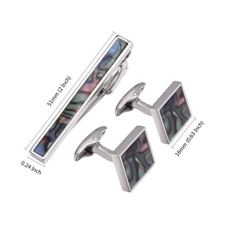 - Anticorrosion Brass and Polished Natural Abalone with nice workmanship. Tie Pin Length 51mm (2 Inch). Square Cufflink Size - 16 x 16mm (0.63 x 0.63 Inch). Round Diameter Size - 17mm (0.67 Inch)