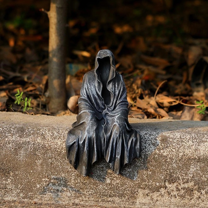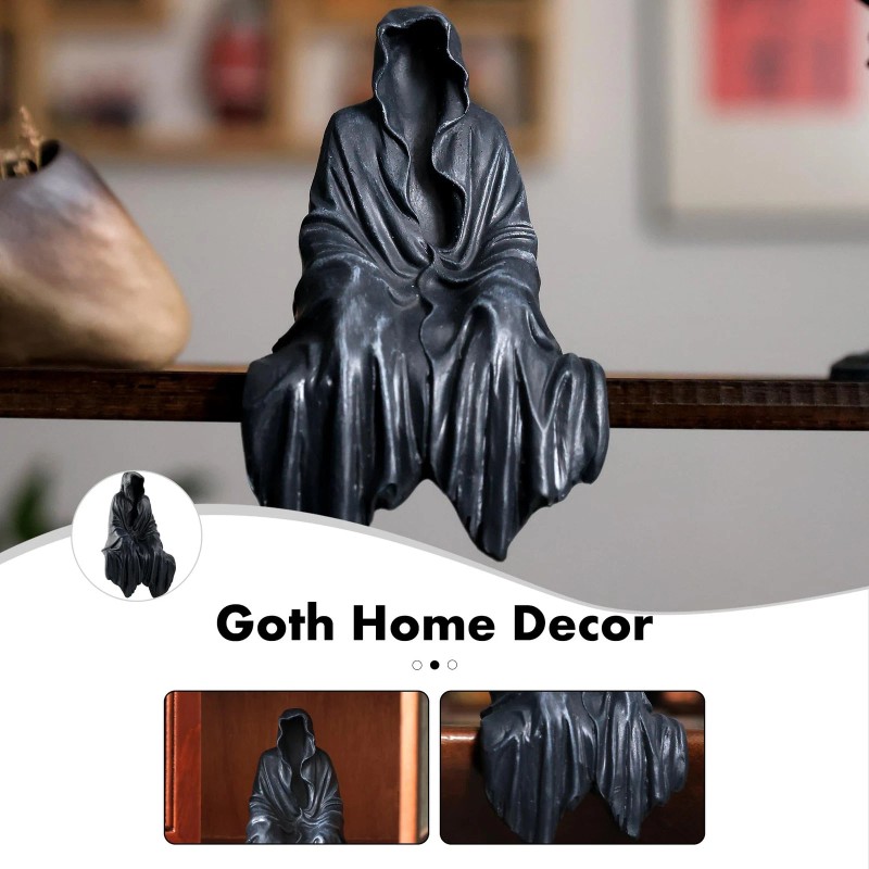 The black robe gothic garden statue is inspired by the Grim Reaper, and it is also ideal for Halloween village and horror table decor, or as a goth bookshelf bookend.