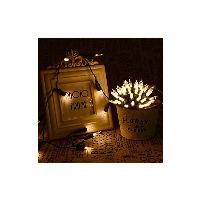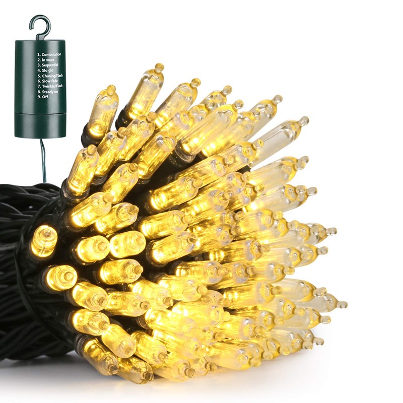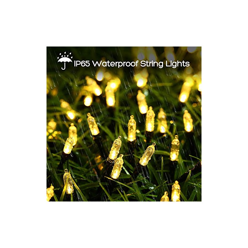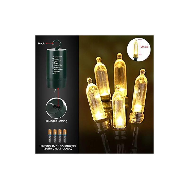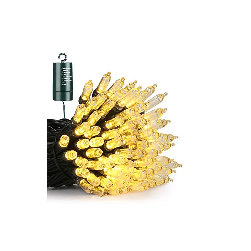 **Battery LED Christmas Lights,33ft 100 LED String Lights Waterproof with 8 Modes & Automatic Timer for Home, Patio, Lawn, Garden, Party and Holiday Decoration (Warm White)** **Specifications:** Total Length:33ft (lead length 0.98ft,lamp spacing 0.33ft) LED Qty: 100 Light Color:Warm white Power Supply: 4 * AA battery (NOT INCLUDED) Waterproof Grade: IP65 Timer Included: Yes (Repeat 6 hours on and 18 hours off) Applicable area :Indoor & Outdoor Wire Color: Green(1.6mm copper wire) Safety:Low voltage, non plug-in, low heat emission and safe to touch after many hours of usage. **8 Light Sequences:** 1.Combination 2.In Wave 3.Sequential 4.Slo-Glo 5.Chasing/Flash 6.Slow Fade 7.Twinkle/Flash 8.Steady On **Note:** Timer function will be reactivated every time when you turn on/off or change modes. For example, if you turn on it at 6pm, then change mode at 8 pm, it will work continuously for another 6 hours with the new mode and turn off at 2am in the morning **What's in the box:** 1 x 100 LED Mini String Lights 1 x User Manual