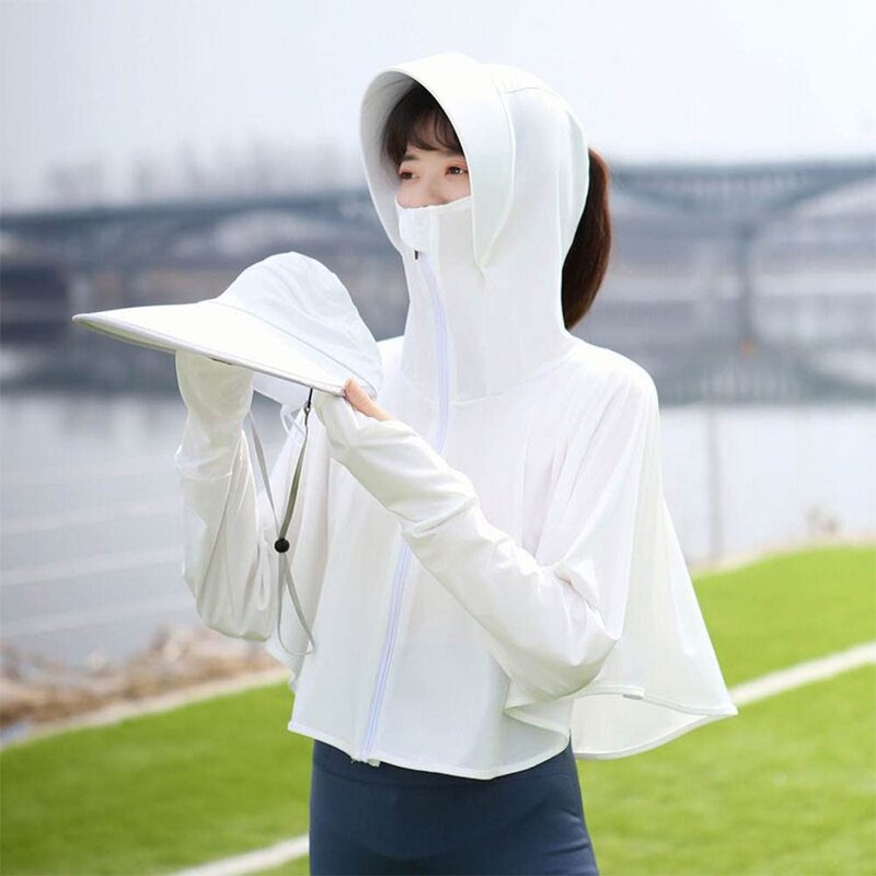 JOONOR Women's Anti-UV Shirt Hooded with Breathable Face Mask, summer outdoor Cycling driving Ice Silk Mesh Cooling Clothing,white