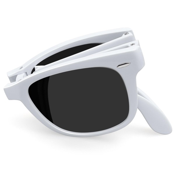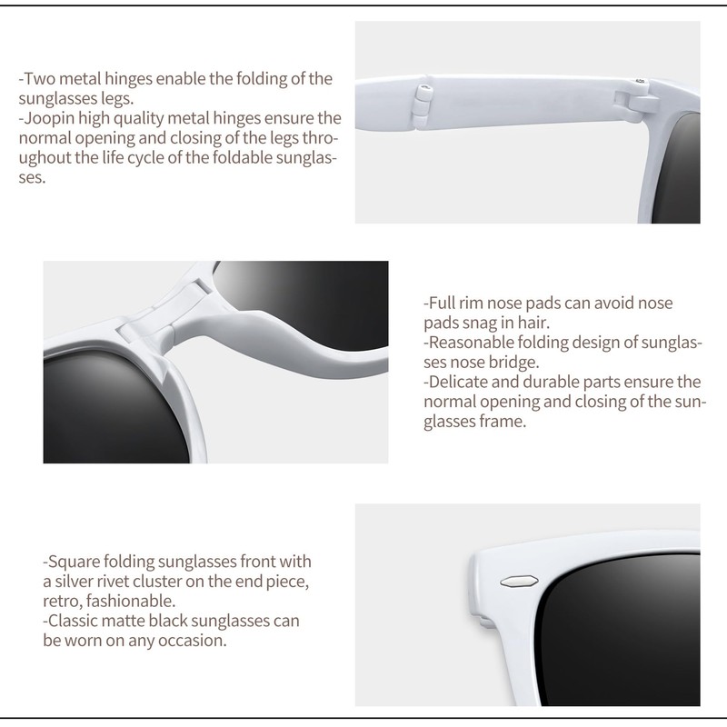 - Package Includes: Folding white frame black lens sunglasses x 1 / hard case x 1 / soft box x 1/ exquisite bag x 1/ Lens cloth x 1/ practical screwdriver x 1/ polarized testing card x1, Joopin collapsible sunglasses are made of polarized UV400 lenses, high-quality plastic frames, lightweight, all the details will bring you an comfortable wearing experience. Joopin focuses on fashion mens sunglasses and womens sunglasses. Click and get your high-quality and cheap sunglasses now