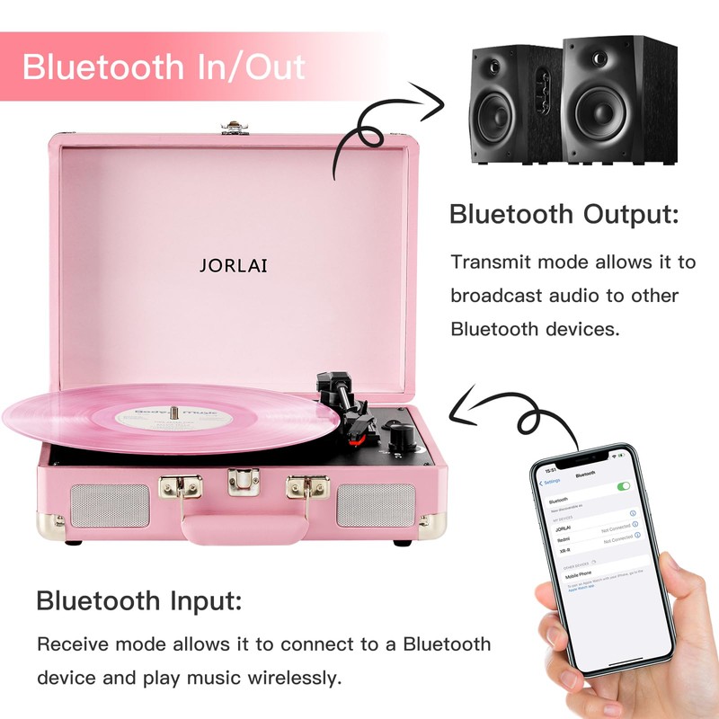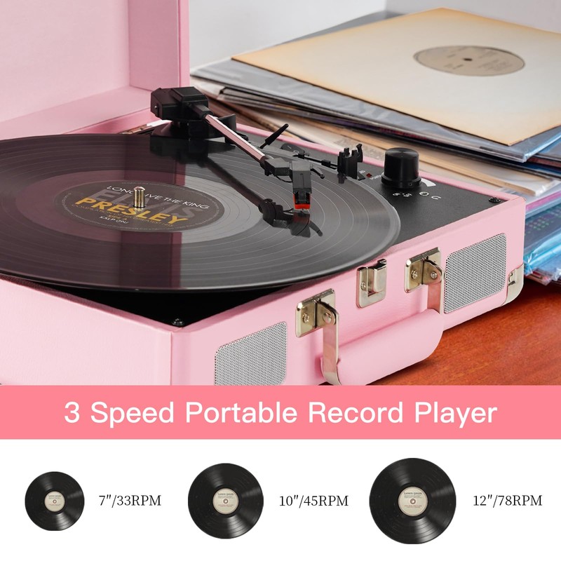 JORLAI Pink Vinyl Record Player 3 Speeds Portable Suitcase Turntable with Built-in Dual Speakers, Bluetooth Gramophone with Built-in Battery 3.5mm Aux Input/Rca Output