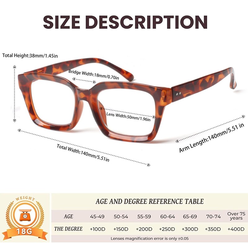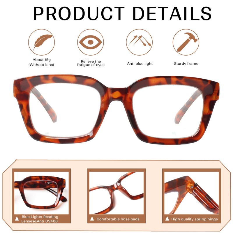 • Lady‘s Stylish Reading Glasses: Beautifully crafted reading glasses for people who loves fashion.The Trendy design of the large and square rims is suitable for all face shapes.Whether you're walking down the street, work, or read, this design will make you more attractive.