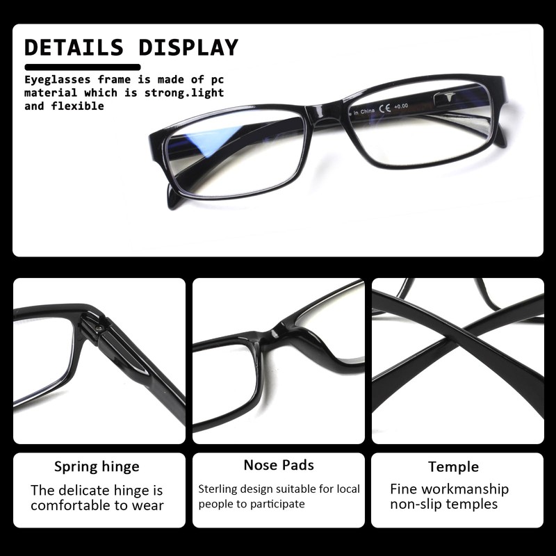 - Stylish and Comfort: Classic rectangular frames in black, tortoise shell, blue and red, Spring-loaded temple hinges provide flexibility in the glasses' temple/arms