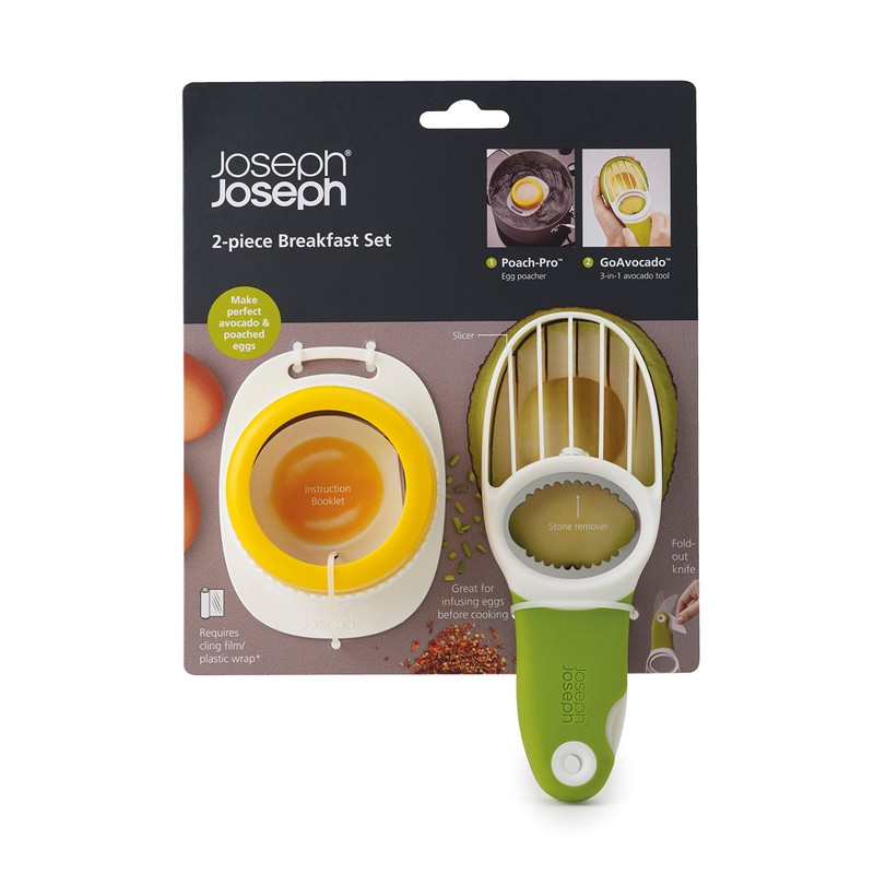 Cook a healthy breakfast in minutes with the Joseph Breakfast Set, which includes the Go Avocado and Poach-Pro. This inventive design of the Poach-Pro allows you to cook perfect poached eggs in water, without the mess. The two- piece design effectively creates a cling-wrap pouch, which neatly holds the raw egg as it cooks, ensuring an even shape and a mess-free pan. What’s more, the pouch allows you to infuse your eggs with other flavors, such as herbs and spices, whilst cooking for a delicious alternative to traditional poached eggs. Preparing avocados can be difficult, messy and even hazardous if using a sharp knife. The Go Avocado provides the complete avocado preparation tool, allowing you to open, de-stone, scoop, and slice the avocado. It features a fold-out plastic blade, a stainless-steel pitter, a curved slicing head, and an ergonomic, soft grip handle.