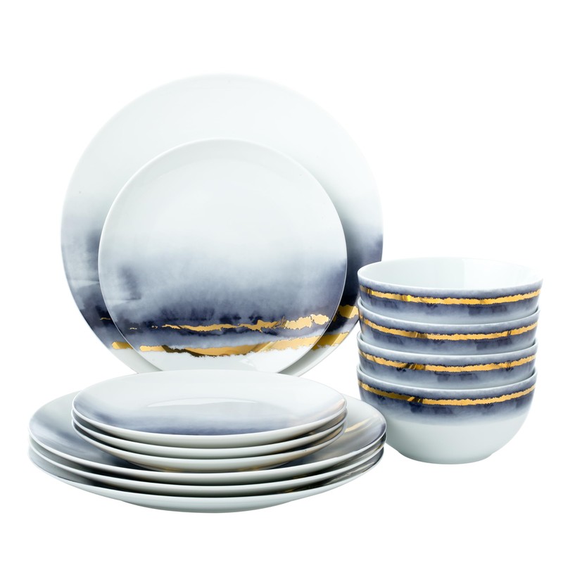 Joseph Sedgh Collection “Lazuli” 12-Piece Porcelain Dinnerware Set, Service for 4, Blue and Gold