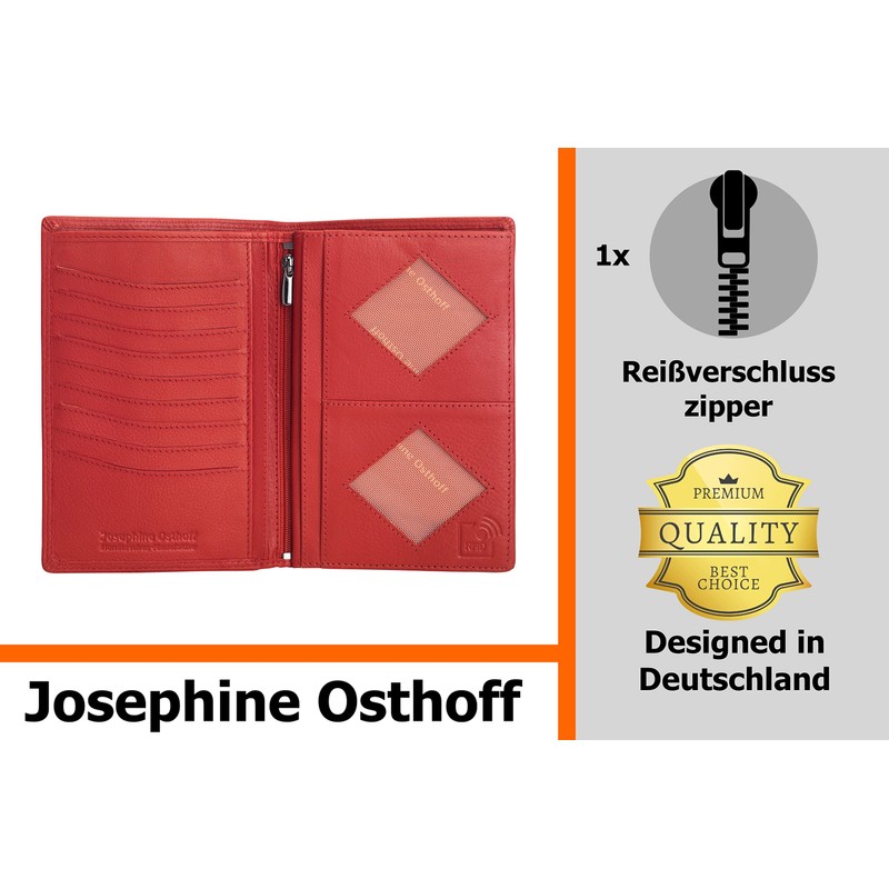 Josephine Osthoff Men's Leather ID Holder, Passport Case, Portrait Format, Women's Large ID Pocket, RFID Protection, Slim Wallet with Note Compartment (942), red