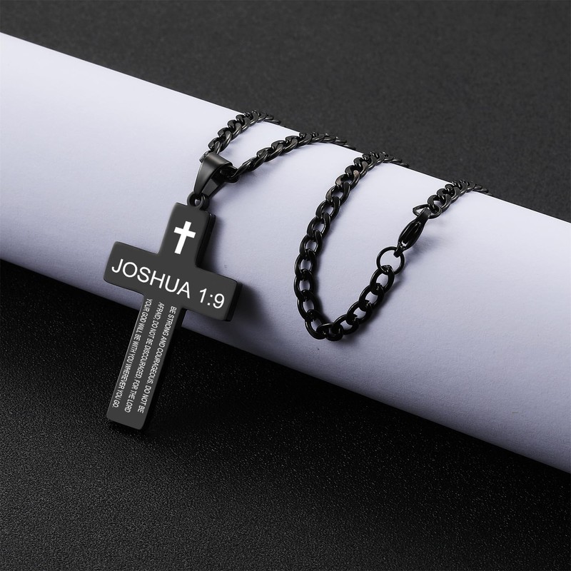 Joshua 1 9 Black Bible Verse Cross Necklace For Men Christian Religious Scripture Faith Baptism First Communion Cross Chain Pendant For Boys Dad Fathers Day Valentines Day Gift for Him