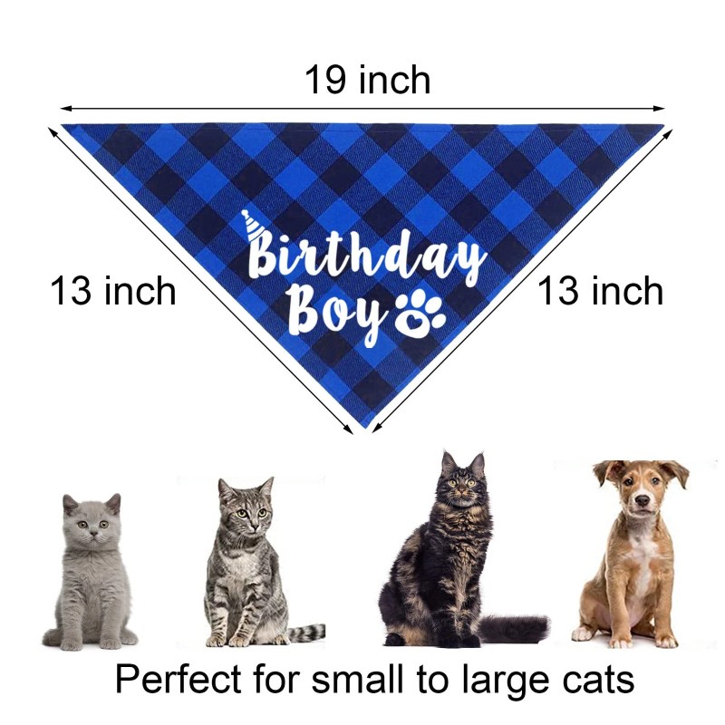 Size: The size of the cat birthday bandana is 19" x 13" x 13", which is suitable for almost all cats. The cat birthday hat with an adjustable elastic cord is about 5" in height and about 3.5" in diameter. The cat birthday bow tie collar is adjustable with a length from 7" to 12.5". The length of cat birthday banner is 48". The size of each banner card is 6.3" x 4.8".