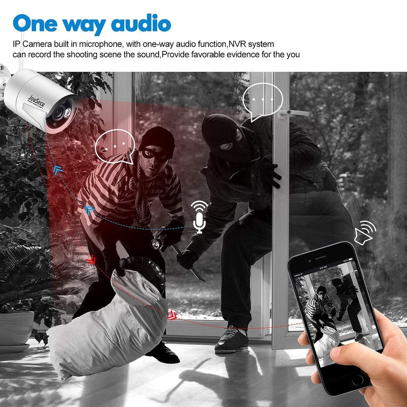 - 【One Way Audio】The IP camera built-in microphone, so the NVR system can record the sound of the shooting scene. You can play the recorded sound of the scene on your phone. In addition, if you have headphones or speakers, you can connect them to the audio hole on the back of the NVR box to listen to the recorded sound.