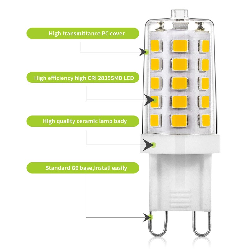 - Energy-Saving: This 4W G9 bulb delivers the same bright glow as a g9 halogen bulb 40 watt but uses 90% less power. Reduce your electricity bills while lighting up living room, bedroom, kitchens, desks, or entryways