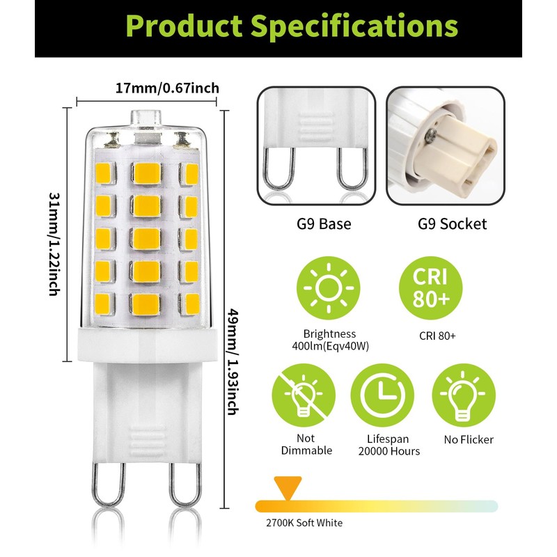 - Compatibility: Standard g9 base, easy to install, directly replace halogen bulbs in ALL G9 fixtures—no tools, please notice: this bulb not dimmable, please do not use with the dimmer