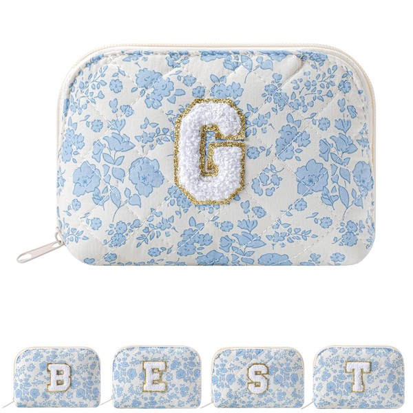 JOVAKIT Conch Alphabet Makeup Bag Cosmetic Bag for Women, Christmas Gifts for Women Girls, Blue Floral Coquette Travel Bag, Zipper Make Up Pouch Organizer Trendy Stuff (Blue Floral G)