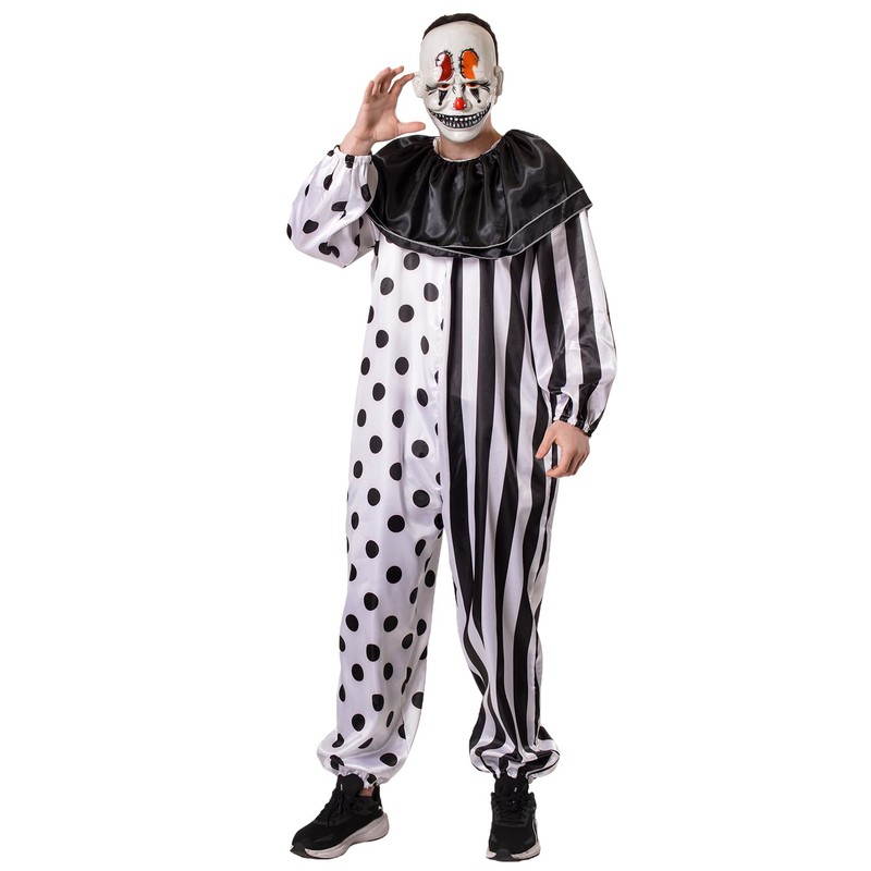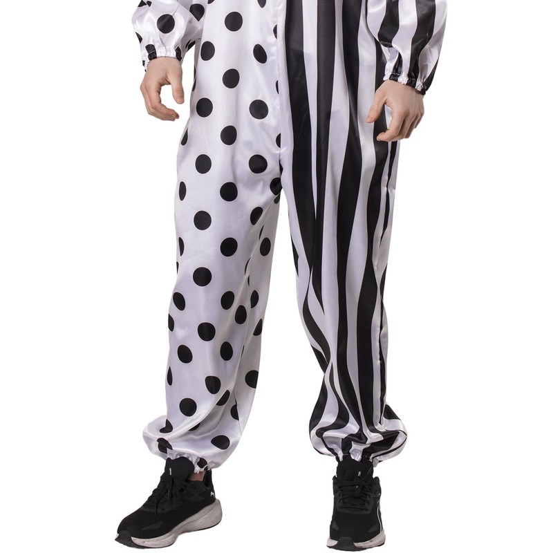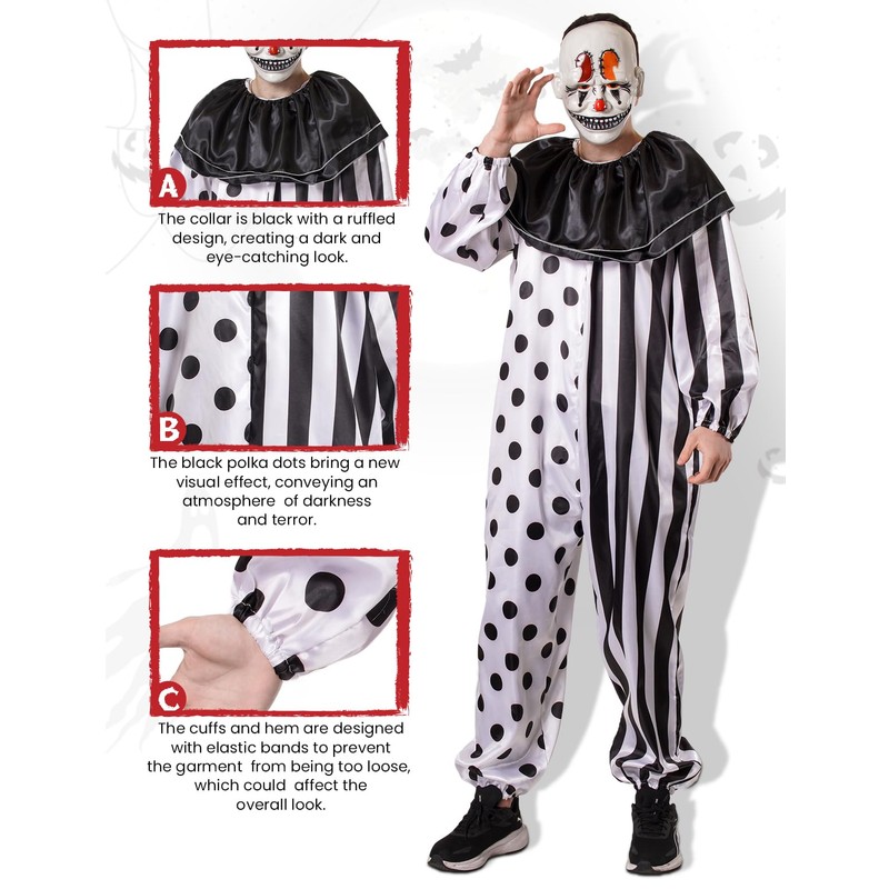- Classic Jester Aesthetics:This Halloween men's jumpsuit features a classic black-and-white polka dot design,It balances the spooky vibe of Halloween with a touch of playfulness. The smooth satin fabric enhances the dimensionality of the dots, transforming you into a "midnight clown" and making you the center of attention at any party.