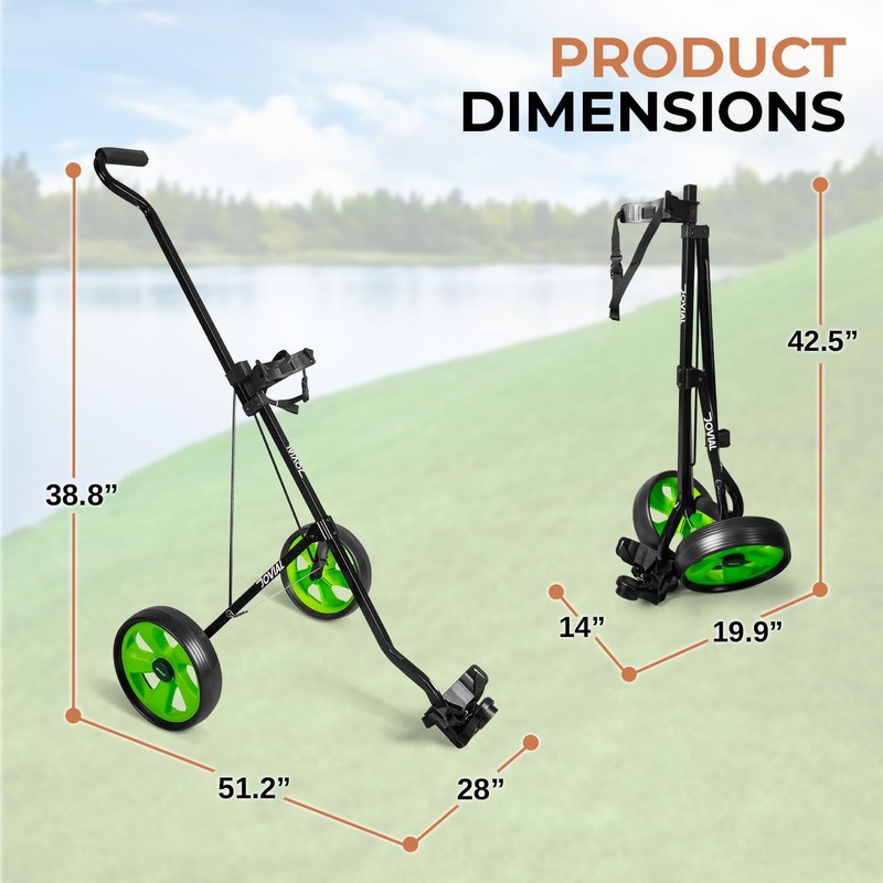 - MADE TO LAST GOLF CART: Made of steel frame, our 2 wheeled golf cart is durable. It has 9.5" rear wheels, and measures 13.6"x 16.7" x 34.6" inches when folded and 40.1" x 26.3" x 43.3" inches when unfolded, load capacity of 28.7 lbs