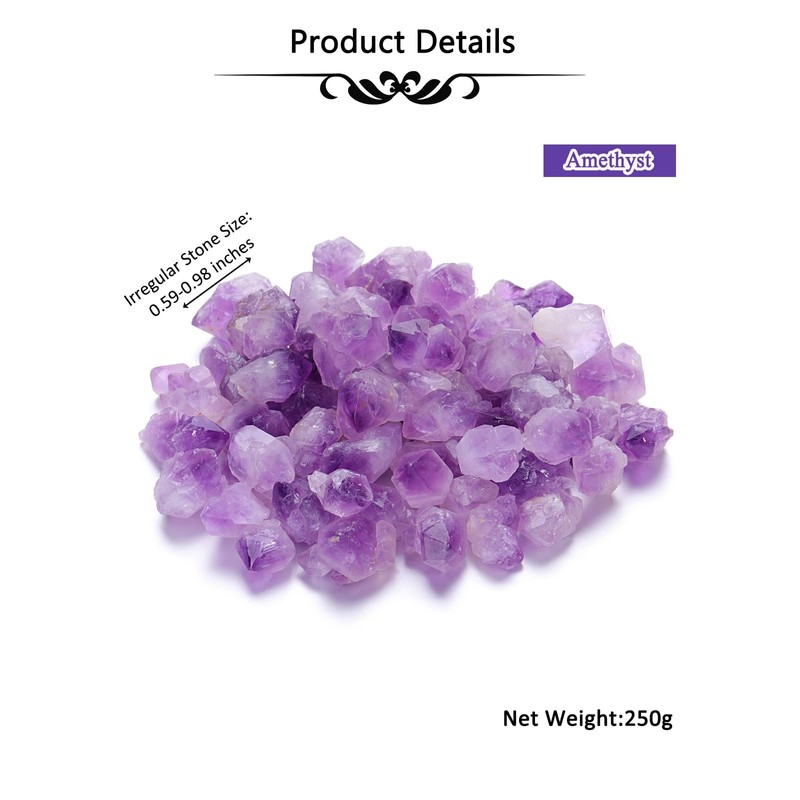 - Amethyst Specifications:0.6-1 inches(15-25mm). Material: natural amethyst crystal. Weight:250g per bag.quantity:60-70 pcs per bag.Package: A bag of amethyst crystals, 1x gift box,1x jewellery card,1x velvet pouch. Due to the nature of gemstone, carving may slightly vary in size, color and shape, each amethyst crystal cluster is unique, vary from lot to lot.You will receive the similar one as the picture showed