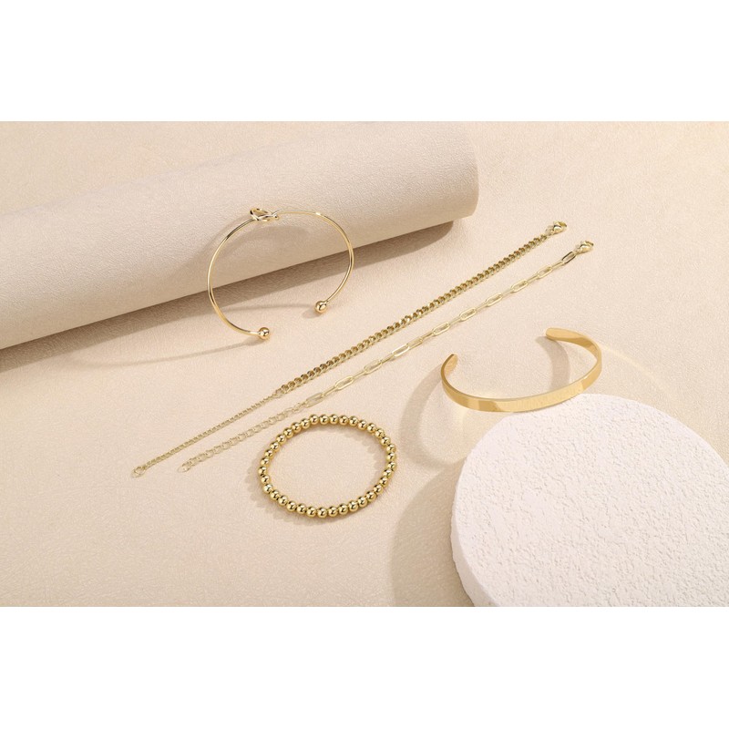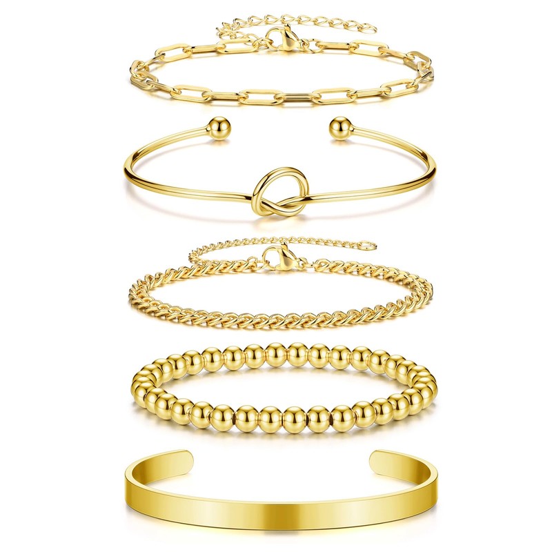 - Gold Bracelets For Womens Gold jewellery for women:5PC 14K Gold plated Bracelet Set adopts different kinds of designs-gold plain cuff bracelet,gold beaded bracelet,gold love knot bangle,Gold cuban chain bracelet,gold paperclip chain bracelet.This gold costume jewellery exudes femininity and elegance,adjustable, allowing you to customise the length to fit your wrist and to stack it with your other gold bracelets in your collection.