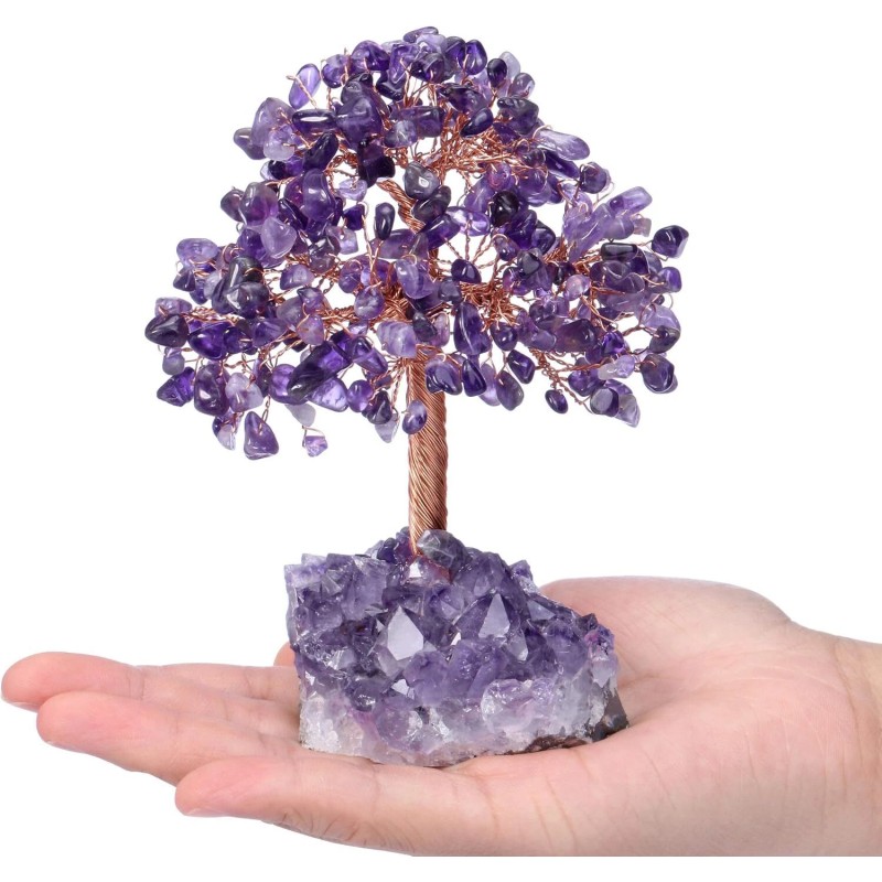 • Handmade Lucky Stone Tree: Polished crystal stones stranded with the copper wire as leaves, copper wire folded as branches, fixed the root on a natural amethyst cluster base, thus forming a beautiful tree, which have the effect of collecting wealth, bring good luck and remove negative energy.
