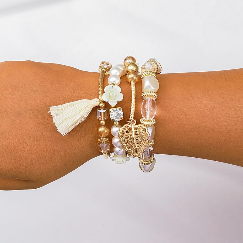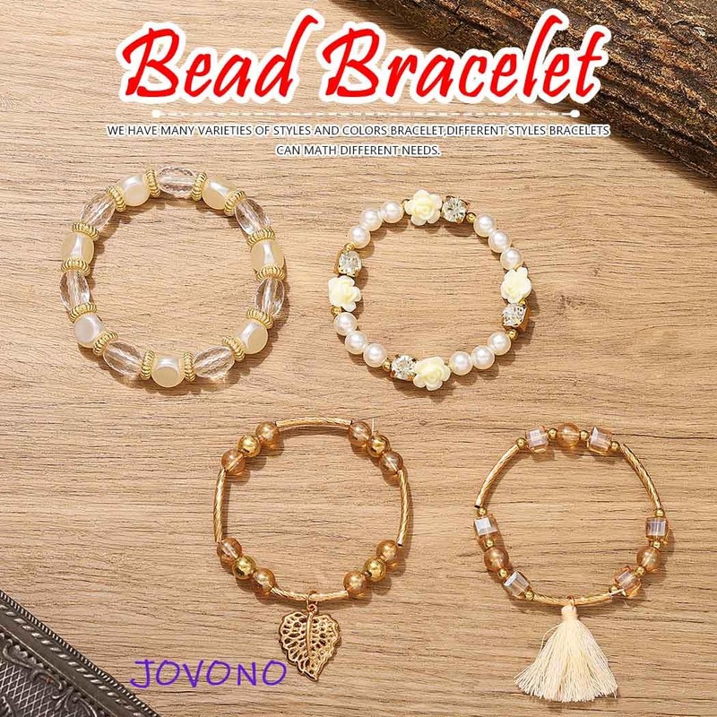 Jovono Boho Bead Bracelets Stackable Gold Elastic Leaf Hand Chain Pear Beads Bracelet Set for Women (4pcs), One Size, Plastic, No Gemstone, Plastic, No Gemstone