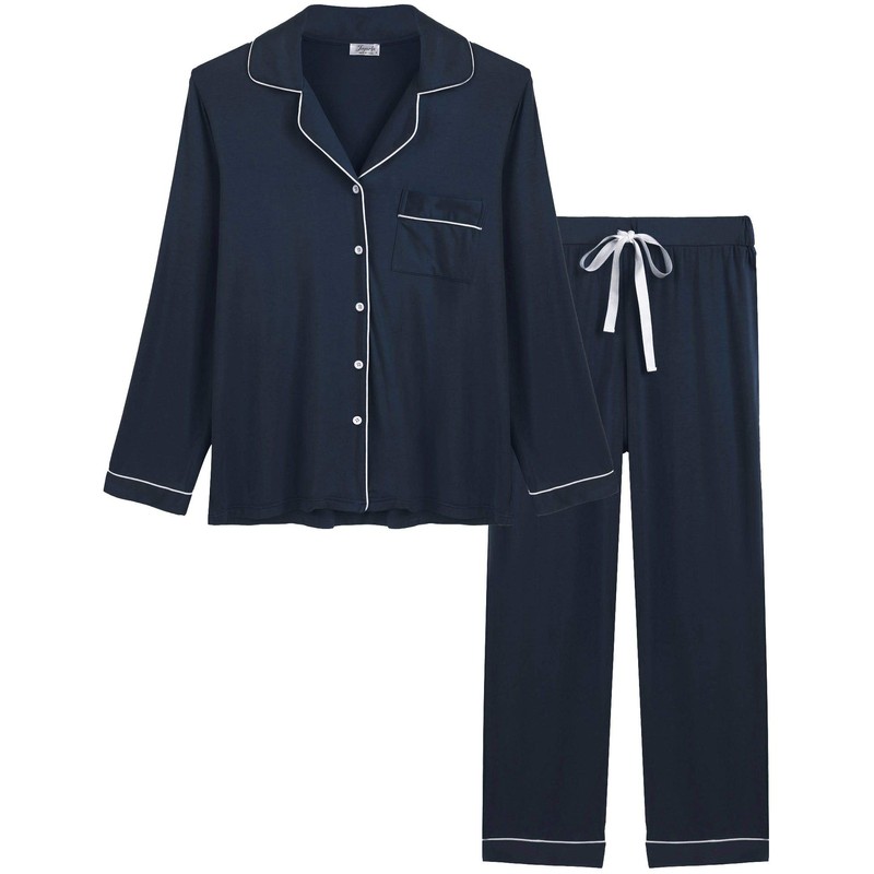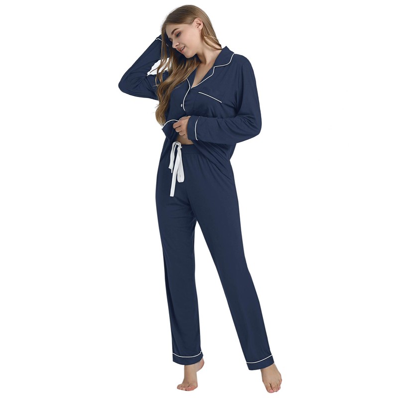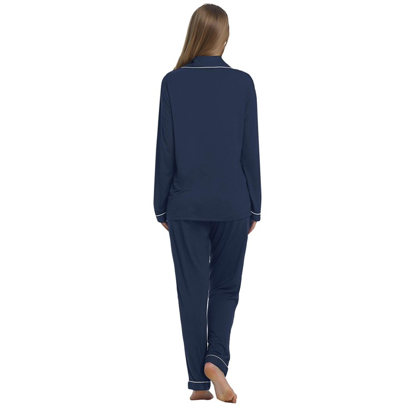 Joyaria Womens Pajama/Pj Sets for Hospital Soft Bamboo Button Down Long Sleeve Top Sleep Wear Navy Blue