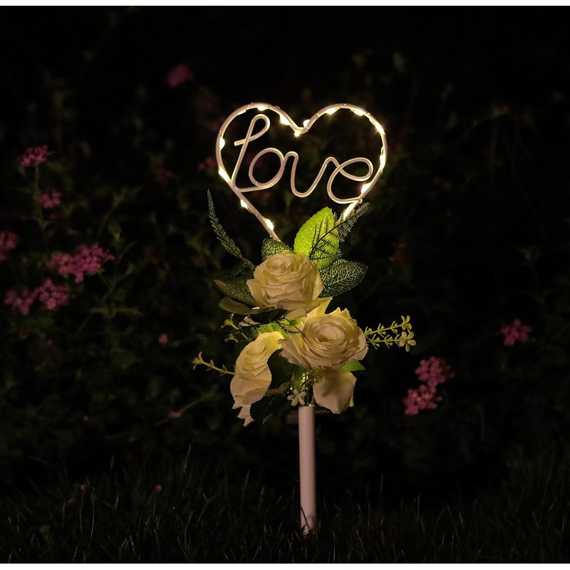 Joyathome 16 Inch Solar Heart Garden Stake Lights with 3 Artificial Flowers Metal Garden Art for Patio Lawn Garden Decor Solar Outdoor Love Sign for Gravesites Memorial and Ideal Gifts for Loved Ones